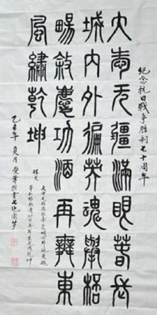 同仇敌忾讨还公道;义愤填膺痛斥倭行。团结一致和平世界;坚韧不拔奋勇向前。千秋伟业东西南北颂;抗战功绩男女老童扬。英豪忠烈书难馨;铁壁铜墙不可摧。