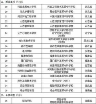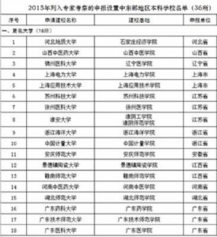 据教育部网站消息,教育部发展规划司日前印发《关于2015年列入教育部专家考察的申报设置高等学校的公示》,《公示》显示,2015年列入专家考察的申报设置中东部地区本科学校36所,其中:18所学院更名为大学,新设本科高校17所,合并调整高校1所。