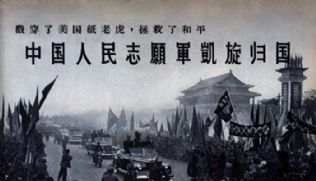 中国人民解放军副总司令彭德怀担当主帅,杨勇、杨成武两位将军领职副帅,统帅50万(后增至一百万)中国人民志愿军,于1950年10月25日,雄赳赳气昂昂跨过鸭绿江。经过三年浴血奋战,征服了气焰嚣张,不可一世的侵略者。于1953年7月27日,朝鲜战争被迫停战。当时新调任的联合国统帅——美国上将克拉克,请求签订停战协定。签约选在出兵的那天。彭老总代表我方,克拉克代表敌方,在三八线上的板门店小镇签了字。我志愿大军胜利凯旋,扬眉吐气;敌军首领克拉克将军却懊丧惭愧地叹息,说:“美国上将在一个没有胜利的停战书上签字,这在美国历史上还是第一次。”