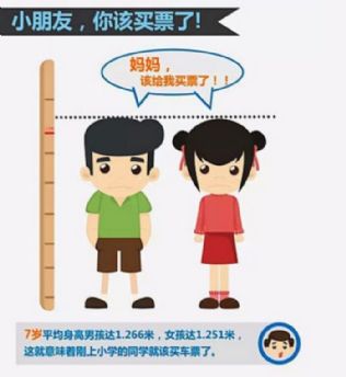 公报告诉我们,以后逃票可是越来越难了。因为我国国民长个儿了!数据显示,我国孩子的平均身高7岁时就已经超过了1米2,其中男孩为1米26,女孩为1米25。(咦,我怎么记得小学时都是女生比男生高呢?)