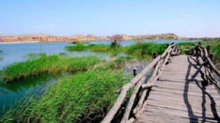 从城墙上下来,我们行走在一条700多米长的芦苇夹道的木栈道上。芦苇的青绿茂密与两侧荒漠的干焦黄土,形成了强烈的对比,此地叫芦花谷。虽然此时还不到芦苇开花的季节,但我能想像到芦花盛开的美丽景致。出了芦花谷,爬上公路,出现在眼前的是一汪幽深的湖水——红山湖。在此码头,我们乘坐一艘漂亮的游船,不但可以休息片刻,还可以欣赏湖光山色的秀美和水岸长城的壮观。我看到两岸独特的雅丹地貌与中间的碧波水流,又是一个巨大的反差!