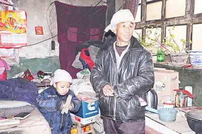 冬月的天气,寒气交织,老丁家却依旧没有生火,只有几根柴火寂寥地堆放在土炕边上。老丁是典型的“面朝黄土背朝天”的农民,全靠父母留下的四亩地维持生计,年收入不到四千元。站在昏暗又杂乱的小屋,记者看到,这个家里除了几个破旧的箱柜和老式电视机外,没有一个能谈得上是生活用品的,最值钱的东西,也许就是老丁拉材用的那辆小三轮车。“今天赚得钱刚好给孩子买点感冒药。”现在的老丁,不仅没有半点积蓄,连日常生活都出现了问题。“说来不怕你笑话,我连蜂窝煤都烧不起。这一袋面也是前些日子好心人送来的。”老丁苦笑着说。而父子俩这天中午的伙食,也不过是早上做好的那一锅疙瘩汤。