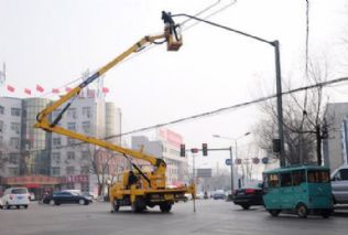 1月29日中午,县路灯管理所的工作人员利用高空抢修设备维修路灯,保障“两节”出行安全。