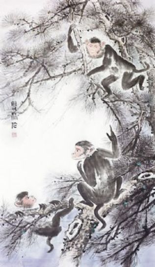 在时间的旅程上,羊儿载着四季的记忆和无数喜怒哀乐的故事远去了,猴儿蹦跳着踏上了新一年的行程。说起猴儿,我们能讲出许多关于它的故事和传说,在中国西南的一些少数民族中,流传着许多以猴为始祖的传说,有些故事还把猴演化为氏族英雄。古代的毛南族,常把形象雕刻在建筑物上、料石砌的坟茔上,以示纪念。瑶族流行一种“猴鼓舞”,达努节时,人们戴起猴面具,模仿猴走路等动作,象征对猴子的敬崇和谢意。怒江流域的傈僳族选择猴日或鼠日、龙日举行婚礼,取猴、鼠群居繁衍快、数量多之意,视为吉祥、人丁兴旺。西部羌族的信仰习俗中,以金丝猴为其护法神,称作猴头祖师,每当做法事时,必戴猴头帽,以象征祖师金丝猴附体。