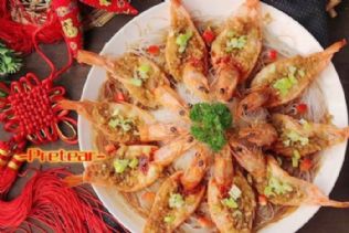 用料:虾10只;大蒜1头;粉丝适量;葱适量;红辣椒适量;料酒、盐、糖、醋、蒸鱼豉油、香油适量;