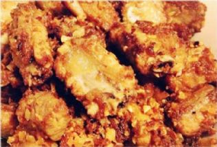 3. 炒锅中蒜油继续利用,加火烧热,把腌好的排骨裹面放入锅里炸熟,捞出控干。(先小火温油炸10分钟,然后一起下锅大火热油冲炸5分钟)。