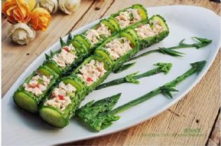 11. 黄瓜盅放入大盘子中摆好,然后再用剪刀将黄瓜皮剪出些竹枝竹叶竹笋,并排摆在黄瓜旁边。随自己所意,觉得怎么好看就怎么摆,最后将调拌好的酸甜鸡肉红甜椒黄瓜丁放入,汤汁也均匀的分散倒入每个盅内,完工。
