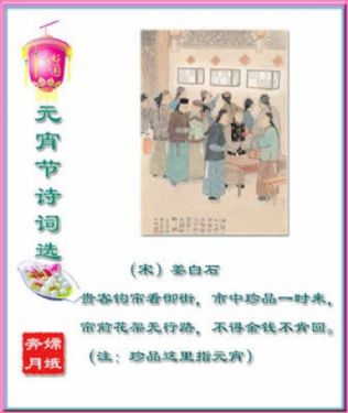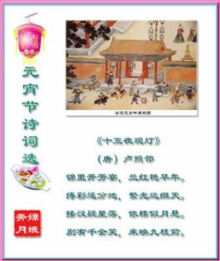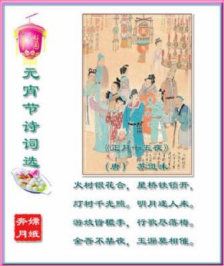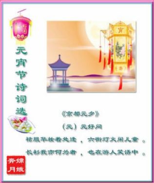 爱元宵三五风光,月色婵娟,灯火辉煌。月满冰轮,灯烧陆海,人踏春阳。三美事方堪胜赏,四无情可恨难长。怕的是灯暗光芒,人静荒凉,角品南楼,月下西厢。