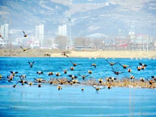 春天来了,冰雪消融,万物复苏,大批野鸭和天鹅从南方飞越崇山峻岭,来到汾河栖息,在和煦的阳光下,湖水、天光、云影、天鹅,构成一幅“春水如绸浸碧天,万鸟竟飞争入图”的画卷。