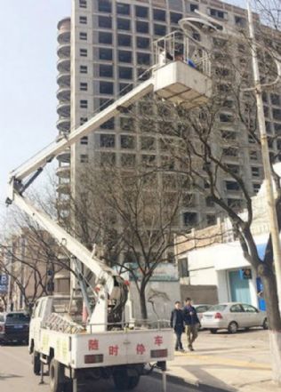 美锦大街一盏路灯故障,市政公司工作人员连饭也顾不上吃就悬梯作业了。