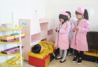 清源幼儿园大五班里,好多“小病人”纷纷来找琪琪医生,个个都举着小胳膊:“琪琪,你给我打一针吧,你给我打一针吧!”琪琪有模有样地在“小病人”的胳膊上比划着,最后还说一句:“好了,摁住哈!”