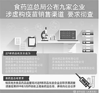 日前,从国家食品药品监管总局获悉,经食药监总局对山东济南非法经营疫苗案查扣药品的数据分析发现,有9家药品批发企业涉嫌虚构疫苗销售渠道。食药监总局要求相关地方食药监局彻查,本月25日前上报调查结果,并由总局统一向社会公布。