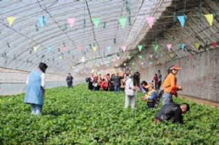 春回大地,天气渐暖,正是草莓成熟采摘的好时节。图为市民正在青堆庄园里采摘草莓。