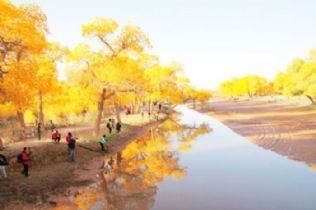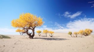 胡杨树被称之“托克拉克”,意为“最美丽的树”。每年国庆节到10月中旬,是胡杨尽展魅力的最美季节。一夜秋风,骤然会把整片的胡杨树由浓绿变成浅黄,继而在短短的几天之内,胡杨叶就会全部变成纯粹的金黄。在湛蓝的天空下和苍茫的沙漠中,宛如阳光一般明媚灿烂。登高远眺,金秋的胡杨如潮如汐,五彩斑斓,漫及天涯,汇成金色的海洋,一派富丽堂皇的景象。而当秋风乍起,金黄色的叶片飘飘洒洒,大地如铺上金色的地毯,辉煌而凝重,超凡而脱俗。