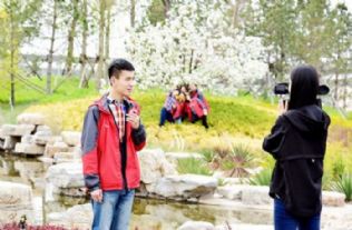 我们一行人在园区内漫步,发现有不少樱花正在盛开,一树淡粉的花朵重重叠叠莹莹如玉,引得众多身在树下之人笑魇如花,恍惚如梦幻一般。这小小的一片樱树,自是不足以演绎樱花盛大的浪漫,但在此时此刻,这些花朵只为伊人飘香,又如何不是春天最美的艳遇?细细想来,也许我们只是这样随意的经过,但这里那些知名的或不知名的花儿却自然随性满含花语为我们呈现了一幅春日盛景,让我们感受到了浓浓春意。人生或许往往就是如此,刻意寻求不能得,无意相逢却倾心。其实,只要心里有春天,无处不芬芳,何需千里行?李小霞
