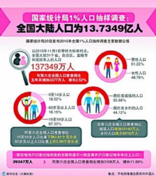 日前,国家统计局发布了以2015年11月1日零时为标准时点进行的全国1%人口抽样调查,数据显示,中国大陆31个省、自治区、直辖市和现役军人的人口为137349万人。这一数据与第六次全国人口普查2010年11月1日零时的133972万人相比,五年共增加3377万人,增长2.52%,年平均增长率为0.5%。专家表示,从1982年至2015年,全国每年净增人口呈减少趋势。