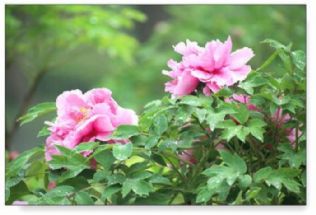 细雨霏霏洒,牡丹朵朵开。含笑迎游客,喜泪挂满腮。或为客尊贵,或因宾英才。相伴周柏傲,性同银杏怀。