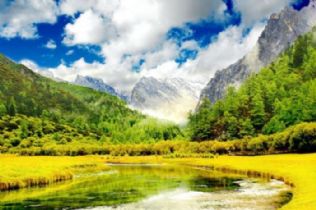 稻城很大,而真正被称为“最后的香格里拉”的地方是在亚丁。车过香格里拉乡不远,便到了亚丁自然保护区。汽车转过了一个又一个的弯道,远处是一座座巍峨的雪山,近看是一片连着一片的金黄色草地。此情此景,足以让我们忘了什么高原反应,忘了自己此时是在3750米高的稻城,我们都迫不及待地要求师傅停车,让我们拍拍照留个影,尽管导游一再告诉我们,前面的风光更美,但我们还是舍不得放过这世间独有的美景。车子还在行驶中,但一路上,亚丁的美已深深地嵌入我们的骨髓。
