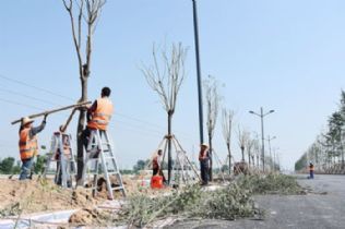 日前,滨河西路南延工程正在加紧推进,道路配套绿化工程进展顺利。据了解,此次配套绿化工程高标准实施,旨在全力打造宜人景观路。工程内容包括中央路心池、机非隔离带和林带绿化,绿化总面积100余万平方米,共分为14个绿化施工标段、1个绿化给水标段。图为工人正在栽植苗木。