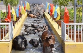 晋丰农庄引进优品黑猪后,科学管理,生态化养殖,为了使猪肉肥而不腻、瘦而不柴、味道更鲜美,该农庄把猪户外放养的通道改建成“游泳池”。每次户外放养的同时,猪都要游两次泳,既增加了活动量,又洗了澡。