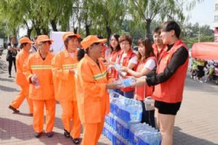 6月18日上午,我县民间慈善组织君搏慈善行在醋都广场举行了主题为“热爱家乡,爱护环境,关爱环卫工人”活动。君搏慈善志愿者向环卫工人赠送了1400余瓶矿泉水,在炎炎夏日给坚守岗位的环卫工人带来丝丝清凉。