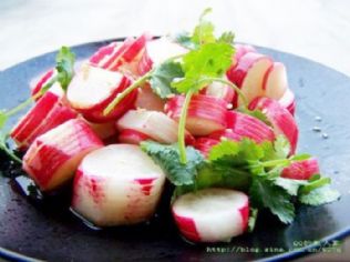 水萝卜水分含量92.9%。和白萝卜不同,水萝卜在夏天较多见,其中的维生素C含量较高,是同等重量白萝卜的2倍。另外它还含有丰富的膳食纤维,可促进胃肠蠕动,有助于体内废物的排出,具有利尿、消食等功效,并且有利于解酒。水萝卜色彩鲜艳,甘甜中带有微微的辛辣,非常适合生吃。