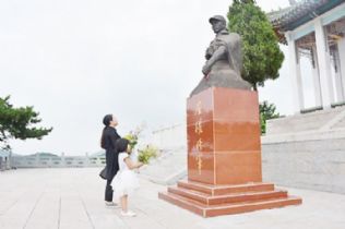 望着将军雕像,刘雯祺与母亲深情款款、泪水盈盈。摘一把野花,编一个花环,轻轻放在左权将军的雕像旁边。