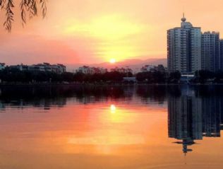 东湖炽暑,夕阳傍照。吹柳成荫,清风醉霞。错落楼影入水,梗阳拥雅韵,橘色度芳华。