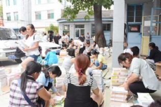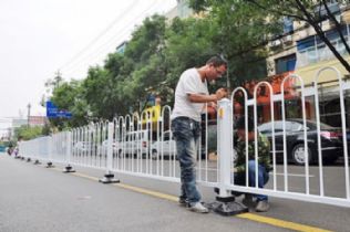 ①8月30日,工作人员在美锦南大街实验校门前路段安装交通防护栏。
