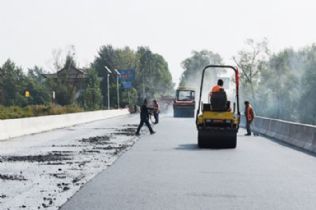 9月19日,贯中大桥路面最后一层沥青铺设完成,改造工程进入收尾阶段,预计在国庆前实现通车。图为施工队伍正在进行路面沥青摊铺作业。