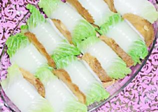 [做法] 1. 猪肉切丝,加盐调味,再用鸡蛋、淀粉上浆;干香菇泡软切丝;胡萝卜洗净切丝;鸡蛋打散,加盐、胡椒粉拌匀。2. 锅中烧开水,将白菜下锅煮软捞出,控水备用。3. 锅中烧油,将鸡蛋摊成蛋饼,盛出切成丝。4. 锅内再烧油,将肉丝下锅滑熟,捞出备用。5. 白菜铺平,将肉丝、胡萝卜丝、香菇丝、蛋皮丝码在白菜上,再将白菜卷起。6. 蒸锅中水烧开,将白菜放入蒸锅中蒸10分钟。7. 将蒸好的白菜卷放入盘中,加盐、糖、鸡精、胡椒粉调味。8. 用水淀粉勾芡,然后淋到白菜卷上即可。