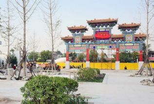 东湖北岸公园计划于国庆期间开园。图为施工人员正在公园正门入口处加紧施工。