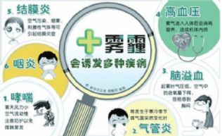 雾霾天气对人体造成的危害是多方面的,PM2.5因为颗粒小,可以直接进入支气管和肺泡,从而被人体吸收,进入血液循环,遍布全身。微尘中的有害气体以及重金属等有毒物质,溶解在血液中,也会导致人体中毒。雾霾容易引起引起急性鼻炎和急性支气管炎等病症,加重支气管哮喘、慢性支气管炎、阻塞性肺气肿和慢性阻塞性肺疾病等慢性呼吸系统疾病,长期处于雾霾环境会诱发肺癌。雾霾还易诱发心血管疾病的急性发作,造成胸闷、血压升高,其中的颗粒污染物引发心肌梗死、心肌缺血或损伤,诱发高血压、脑溢血等疾病。雾霾会加剧流感病毒的传播,特别是人群聚集的地方。
