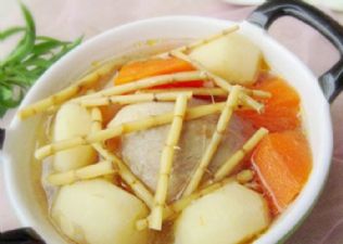 ②马蹄茅根萝卜汤(清热解毒)【材料】马蹄10个,新鲜茅根4两,白萝卜1个,瘦猪肉4两,生姜1片。【方法】马蹄、白萝卜分别去蒂、去皮,切厚片,洗净,备用;新鲜茅根(可用干净水草捆绑成一扎一扎)、瘦猪肉、生姜刮皮分别清水洗净,备用;瓦煲内加入适量清水,先用猛火煲至水滚,然后放入以上全部材料,等水再滚起,改用中火继续煲两小时左右,加幼盐调味,即可饮用。【功效】有清热解毒、生津止渴、润肠通便的作用。适用于烦渴,口腔溃疡,咽喉肿痛,大便不顺畅,小便黄赤,排尿涩痛等症状。