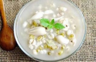 ③绿豆薏米灯芯粥(清热利湿)【材料】绿豆3两,生薏米2两,灯芯花10个,腐竹15克,陈皮1角,粘米适量。【方法】绿豆、生薏米、粘米、灯芯花、腐竹、陈皮,分别用清水洗净,备用;瓦煲内加入适量清水,先用猛火煲至水滚,然后放入以上全部材料,等水再滚起,改用中火继续煲至粘米开花成稀粥,加少许幼盐调味,即可食用。【功效】有清热解毒、利尿祛湿的作用。适用于烦躁,口干,唇红,面部生疮,小便黄、尿量少,甚至排尿时尿道涩痛等症状。