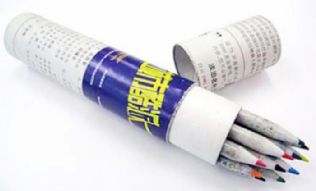 环保笔:这是用废旧报纸卷成纸制铅笔,其价格比普通铅笔便宜。目前,国内已有部分文具企业对环保笔进行研发和生产。而且还开发出了纸制铅笔、纸制圆珠笔、纸制签字笔、纸制文具盒、纸制学生书桌等系列的多种办公学习用环保文具。