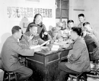 为了更好地利用幻灯宣传好党的各项方针政策,宣传好农业学大寨的先进事迹,公社党委批准电影队购买了一部上海海鸥牌120照相机,当时全县只有县委宣传部、县电影管理站各有一部120照相机,公社举行大的活动,召开大的会议都要安排我去照相。唯有开党委会没有照过相。1987年的一个晚上,我们电影队没有演出,妇女主任王永萍到电影队找我,说公社党委开会集体学习,想照一张像,我拿起相机到党委办公室,将对面王永萍坐的位置调整了一下拍了这张公社两委集体学习的照片,这也很可能是郭丁旺书记在西谷公社任职内唯一一张党委全体成员开会学习的照片。