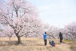 四月正是杏花绽放的季节,远远望去,粉红色的花海吸引着众多游人踏青赏花。图为游人在马峪乡涧沟村赏花拍照。