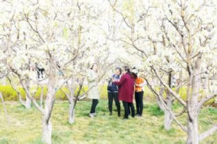 当前,东湖公园梨树正值盛花期,吸引了众多市民前往踏青赏花。图为游人赏花拍照。
