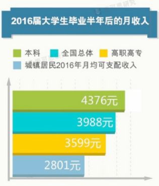 第三,大学毕业生月收入高于城镇居民平均水平,且高等教育在毕业3年内回报明显。2016届大学毕业生月收入为3988元。其中,本科院校2016届毕业生月收入为4376元,高职高专院校2016届毕业生月收入为3599元,均高于城镇居民2016年月均可支配收入(2801元)。另外,2013届大学生毕业3年后平均月收入与其毕业时相比涨幅为84%。其中本科涨幅为87%,高职高专涨幅为81%。