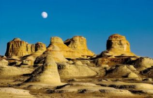 行驶了七个小时,田野早已消失,取而代之的又是满眼金黄。魔鬼城在黄沙中不知伫立了多少年,等待着我们这些旅人去揭开它神秘的面纱。这里是风口,一年四季狂风不断,岩石被打磨得奇形怪状,气流从中穿过,犹如魔鬼的哭嚎,因而得名魔鬼城。