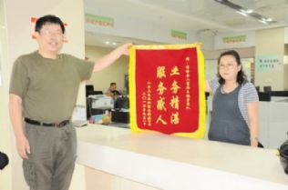 本报讯昨日下午,山西大禹雨虹防水科技有限公司负责人刘玉军将一面写有“业务精湛,服务感人”的锦旗送至政务大厅工商质监局窗口王振孝团队工作人员手中,感谢他们提供细致、周到、高效的服务。
