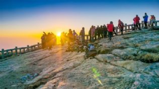 东边的天空渐起一线红色,又倏忽隐去。游客们添了观赏胜景的信心,长枪短炮般的相机、手机都举到眼前,就等红日初升。