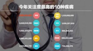 大会发布的数据显示,2017年用户关注度最高的10种疾病多是常见病和慢性病。其中,“肿瘤”以超过36亿次的关注度跃居国人最关注的十大疾病之首,高血压和糖尿病的关注度也都超过了30亿次,分列第二和第三。去年的榜首是高血压,阅读次数为21亿次+,今年的热度增加近10亿。