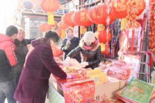 春节临近,年货市场购销两旺,大小商铺的顾客络绎不绝,灯笼、对联、中国结、年画等烘托出了浓浓的年味。