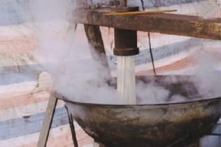 捏钵钵用硬杂木制成,呈葫芦状,由上下两件组合而成。下部是呈臼状的钵钵,高约十公分左右,中间为直径五公分空心的钵钵,下底固定着冲有园形漏孔的金属片;外径约七、八公分呈葫芦状,好像一只平口的花瓶。上部为一个直径五公分高十公分的活塞,与下部的臼穴吻合。与活塞一体的提手好像一只图章。那个园形的章呈园饼状,与下部的瓶口相对,便于捏。顶端高出约五六公分为提手,做捏钵钵时,左右手的拇指在上面的活塞上,食指与中指在下面钵钵的平口处,相对用劲捏,,将活塞挤压下去,将钵钵里放好的面,从捏钵钵底部的园形漏孔中压到锅里的沸水之中。用筷子翻搅拨开粘在一起的面条,翻煮一、两分钟,将面条捞出来,香甜美味的捏钵钵就做好了。如果捏得感觉力不从心时,还可以用前额顶在上端,头手一同发力将捏钵钵做好。这种工具体积比较小,适宜家庭使用。所以一般家庭就用捏钵钵吃河捞面,而大灶上就要用河捞床了。那种河捞床可以担在大锅上,臼穴也比较大,可供多人食用。
