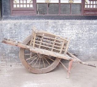 茅车,其实就是手推车,它用木头制成(后来有用铁管等),上面是八字形的两根车把,中间用木条连接起来,下面是一个胶皮轮子。我县河西地区叫茅车、圪拱儿,河东地区又叫地猪儿。两地叫法不一,在形状上也略有不同:茅车比之地猪儿,增加了前脸和侧框,尤其是侧框的增加,更是河西人民的创造,使得载重量成倍增加。