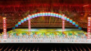 在数万名观众的期待中,聚光灯下,一位手持红绸的舞者飞步进入舞台中央,舒展奔放。那一抹飞扬的红绸,伴随有力的舞蹈幻化为倒计时的数字影像,点燃了全场的热情。