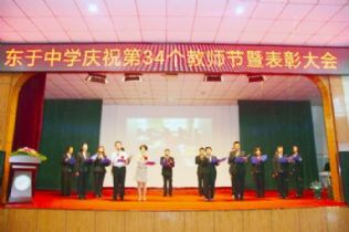 9月14日上午,东于中学举行庆祝第34个教师节暨表彰大会,对郝林开等2位先进工作者,郝文艳等6位优秀班主任,杨利荣等9位优秀教师进行表彰。