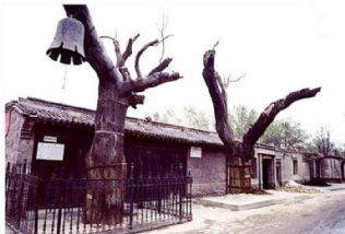 继续前行,远远就望见了《地道战》中的那棵老槐树和那口大铁钟,老钟叔的高大形像一下子涌现在我脑海里,一种亲切感油然而生。导游告诉我们,当年的大钟早已化成铁水,做成地雷用了,这是后来人们根据原样,重新制作的挂了上去。在老槐树旁边的一座房子里,导游让我们看了当年作药铺的一个地道口。这是用粘合在一起的地砖制作的一个地道口,平时可以用柜台盖住,一旦用时就可以脱身。在街道的北边,也是一个沿街的院子里,导游让我们看了用马槽作掩护挖得地道,槽底木板可以抽动,下边就是地道口。我们还参观了用锅台、土炕做得地道口,院子里的真假枪眼等,真是大开了眼界!
